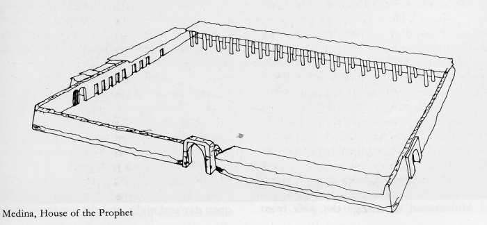 Nella moschea di Medina, il tempo, la tomba del profeta viene inglobata dalla moschea. Inoltre, nella qibla, viene introdotta una nicchia concava che si chiama mihrab; dal 700 in poi la mihrab diviene una costante in tutte le moschee che vengono costruite: tale spazio serve a commemorare il luogo in cui pregava il profeta. Da un edificio molto semplice senza spazi gerarchici al suo interno ci si avvia verso una costruzione più strutturata.