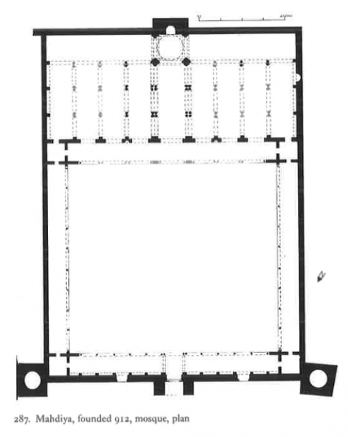 La moschea di Mahdiyya è la prima moschea fatimide. Non si tratta di una moschea monumentale. Il modello è la moschea di Qayrawan. Vi è un ingresso monumentale alla moschea dove solitamente si trovava il minareto, si tratta di una novità. L'origine dell'ingresso è quella dell'arco trionfale romano, una costruzione commemorativa. Gli archi trionfali romani, nei secoli successivi, è stato inglobato nelle cinta murarie; è questo il modello a cui si sono ispirati i fatimidi. Si tratta di un arco a ferro di cavallo, ovvera che rientra leggermente alla base; si diffonde solo in Nord Africa e al-Andalus. E' possibile che vi fosse un'inscrizione nell'arco, cancellata a posteriori. Infatti a Qayrawan è presente anche una piccola moschea di periodo pre-fatimide dove sopra l'ingresso sono presenti delle iscrizioni.