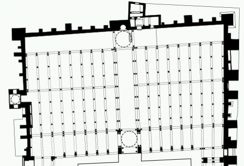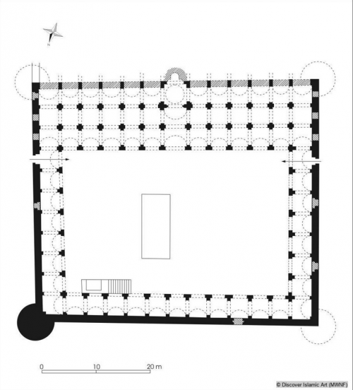 Lo spazio a nord della moschea è il cortile, mentre la qibla è la facciata sud. Nella qibla sono presenti più mihrab, poiché il muro è lungo più di 100m. La sala di preghiera è suddivisa in tre navate. Al centro della sala di preghiera è presente un transetto: una navata che interseca le altre tre che le sono trasversali; nelle intersezioni sono presenti dei robusti pilastri per sostenere il peso. Le navate possono essere trasversali o parallele alla qibla; quando sono trasversali quella centrale è più ampia e ha la stessa funzione del transetto.